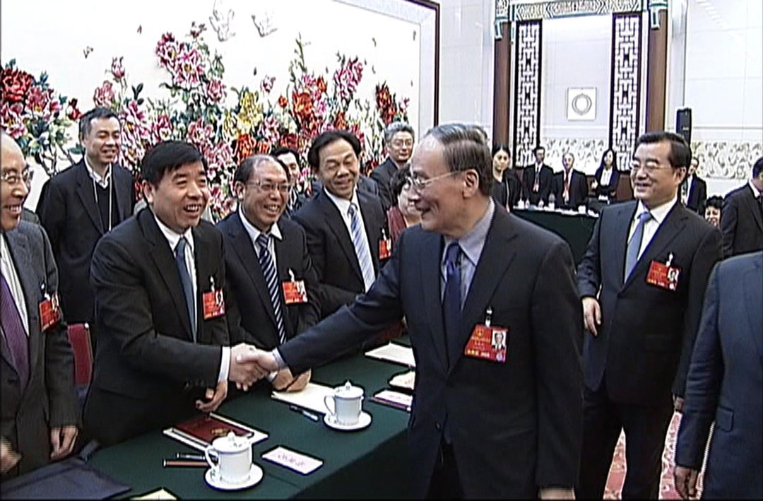 時(shí)任中央政治局常委、中央紀(jì)委書記王岐山與楊建忠董事長親切握手